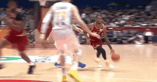 第三节比赛中,琼斯下顺起飞接球,在周琦头上完成双手空接暴扣。